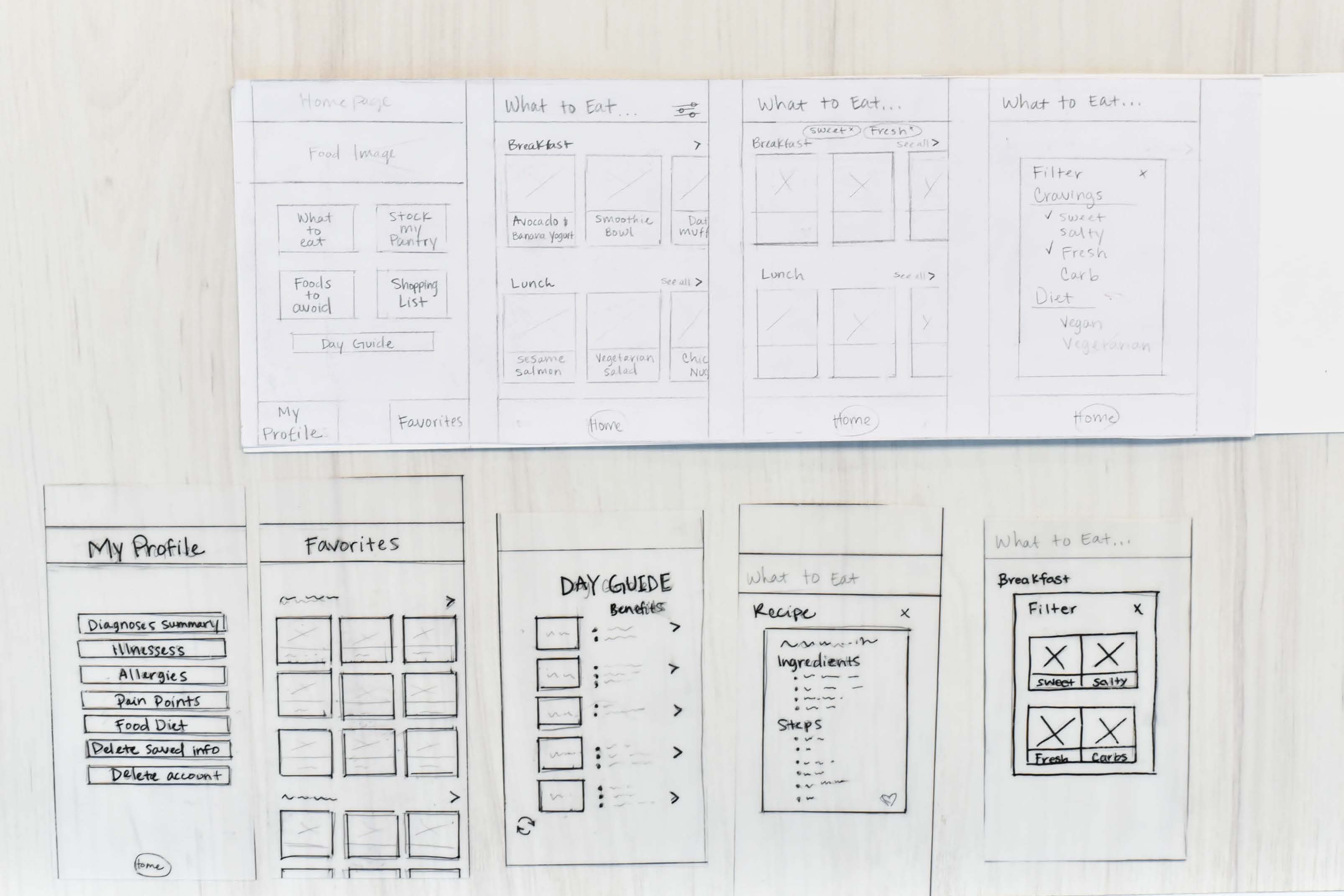 We began our user testing with a low-fidelity paper prototype. During the process we had our users sign a release and consent form to make sure they were well aware of the confidentiality around the app. We tested two users who are very familiar with chronic illnesses and the different food restrictions chronic illnesses can have.