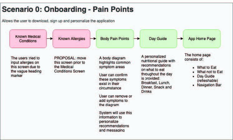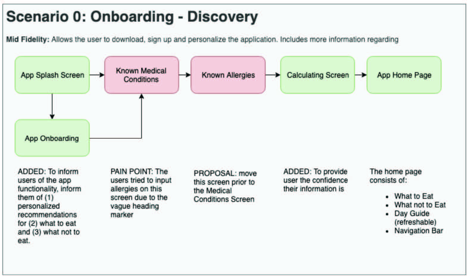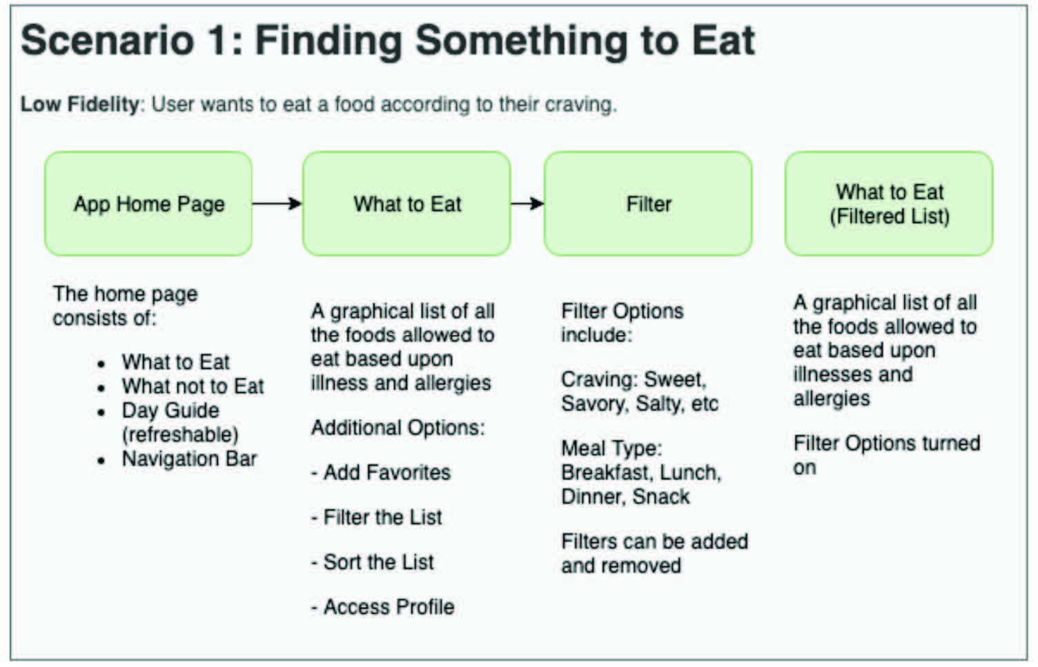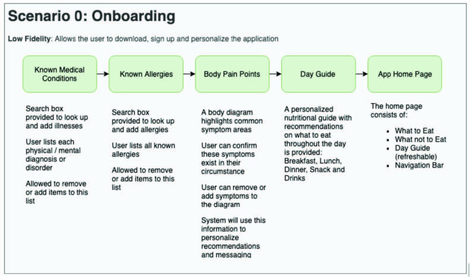 The low-fidelity prototype began with rough sketches of what could be included in the app. In order to illustrate all our ideas and features we made two scenario flows. The first user flow was Scenario 0 - App Sign Up which allowed users to download and configure the application. This flow consisted of the user logging in information such as food allergies or recommended foods to avoid as advised by their medical doctors. Based upon this information provided, the app would then compile and customize all food recipe recommendations and restrictions for their unique circumstances